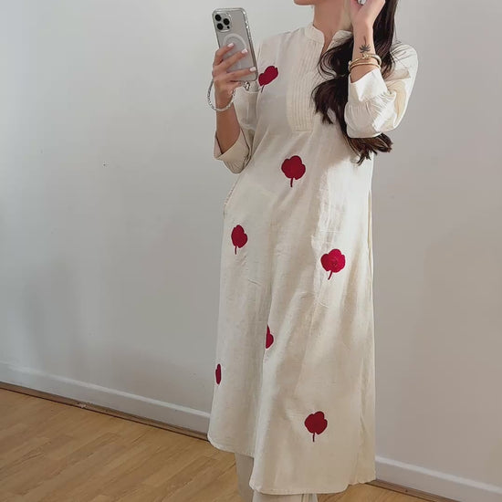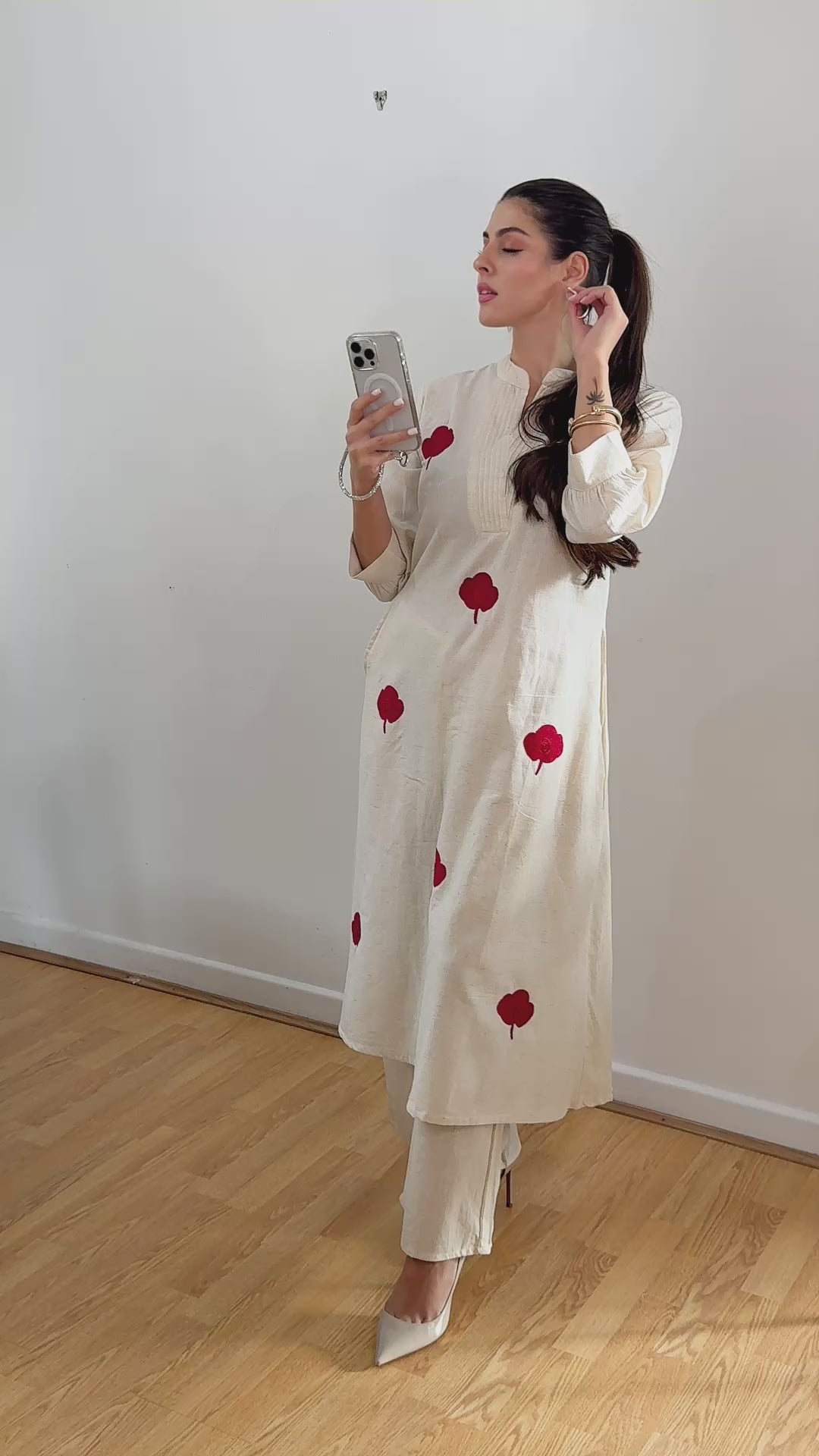 Elevate your daytime elegance with Rosa, a serene off-white kurta set crafted from soft pure cotton that promises breathability and ease. The ensemble features exquisite floral thread-work embroidery throughout, offering delicate detail without being overly ornate. The straight-cut kurta pairs effortlessly with coordinating palazzo bottoms for an easy, graceful silhouette. Perfectly suited for brunches, relaxed gatherings or subtle festive moments, Rosa embraces understated style with comfort at its heart.
