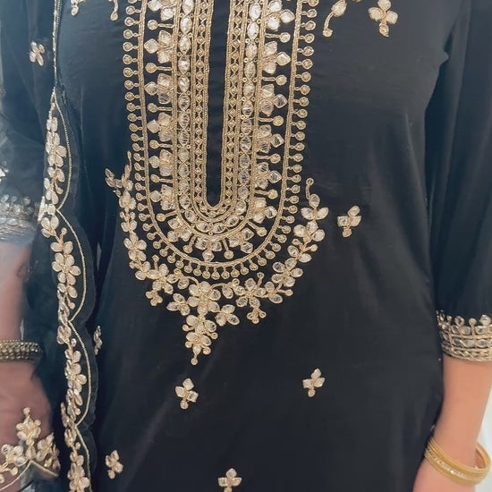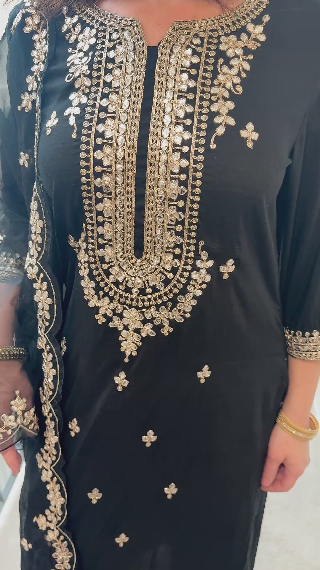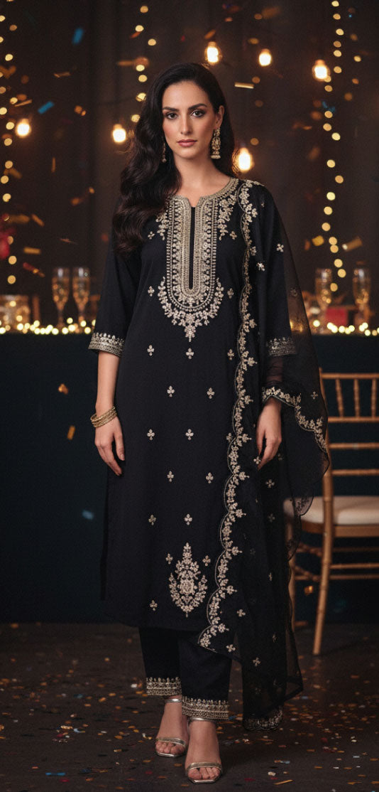 Elevate your festive wardrobe with the Rhea Black Silk Blend Suit Set, exquisitely adorned with pearl, mirror, and zari embroidery. Designed to reflect timeless elegance, this ensemble blends classic craftsmanship with contemporary finesse. The rich black base enhances the intricate handwork, making this outfit perfect for weddings, festive celebrations, and evening events.